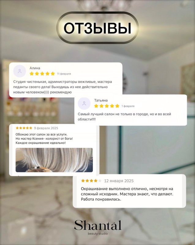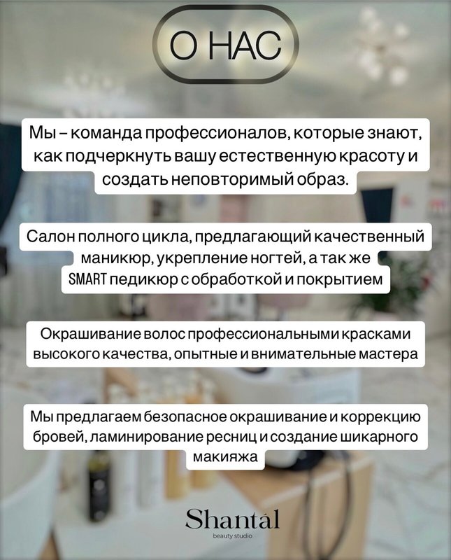 Вы все еще считаете, будто салоны красоты - странный каприз и ненужная трата денег? Приходите в студию красоты SHANTAL и убедитесь в обратном! Безупречный профессионализм наших парикмахеров, косметологов, визажистов и мастеров по маникюру не только обеспечит вам уровень ухода, которого невозможно добиться в домашних условиях, но и даст шанс по-настоящему преобразиться, найдя новые стилистические решения. У нас вы забудете о стрессах будней и испытаете тот роскошный уровень заботы, который никого не оставит равнодушным!